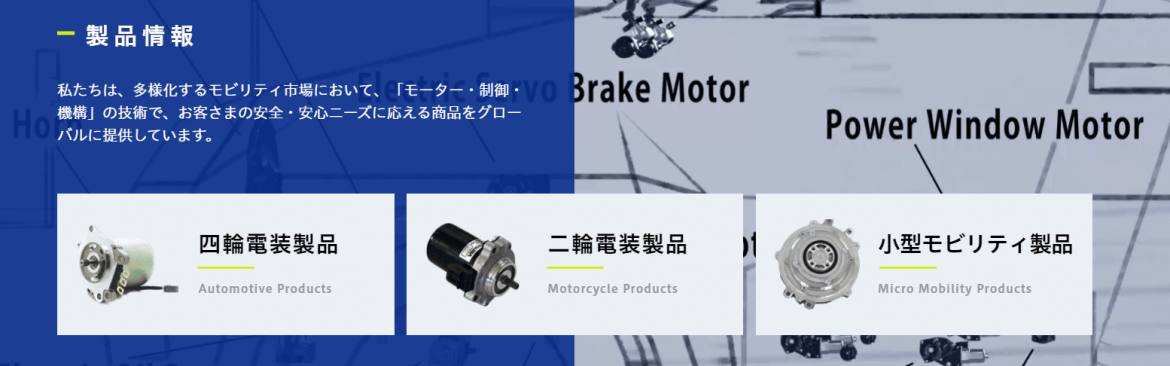| 事業内容 | 四輪・二輪自動車用電装品(ワイパーシステム・スターターモーター・パワーウィンドウモーター・ パワーステアリングモーター・パワースライドドアドライブシステムなど)の開発・製造・販売 |