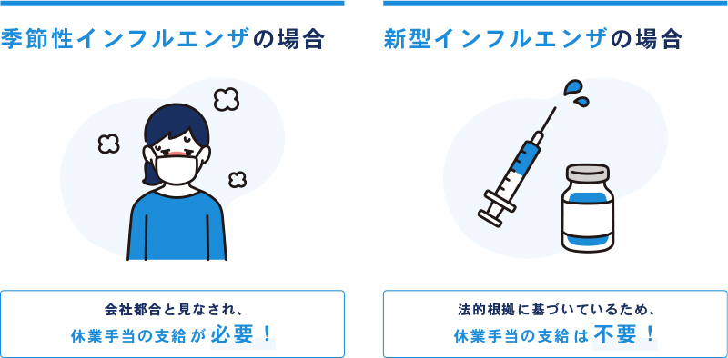 一方で、新型インフルエンザに関しては、「特定感染症」に指定されており、社会に大きな影響を及ぼす可能性があるため、従業員の出勤停止が法律によって義務付けられています。