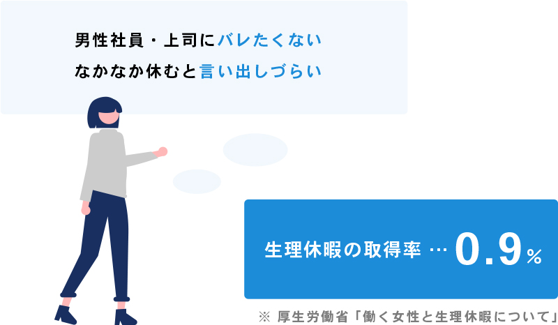 厚生労働省の調査によると、生理休暇の取得率は0.9%と非常に低く、その理由には職場環境や男性の理解不足などが挙げられます。取得を行わない理由としては、