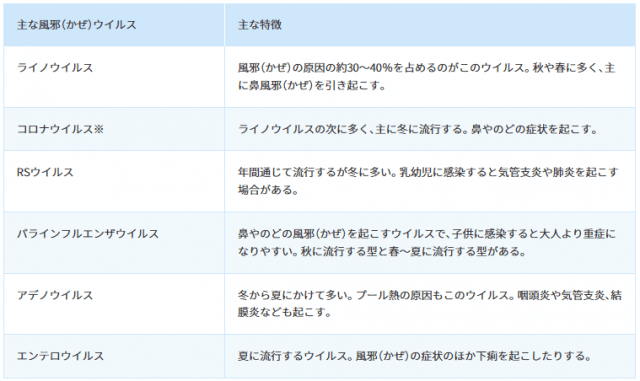 風邪(かぜ)を引き起こす主なウイルス(インフルエンザ、新型コロナ以外)