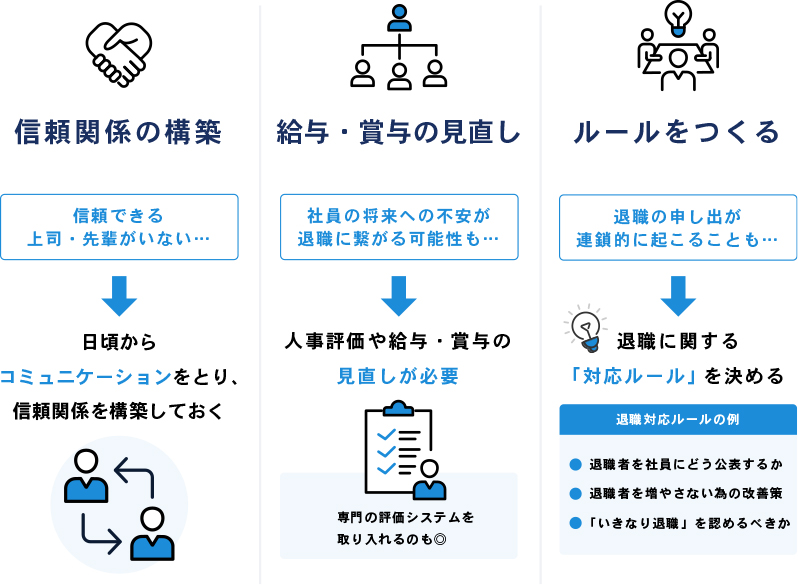 などといった、退職に関する「対応ルール」を決めておくのが効果的でしょう。
