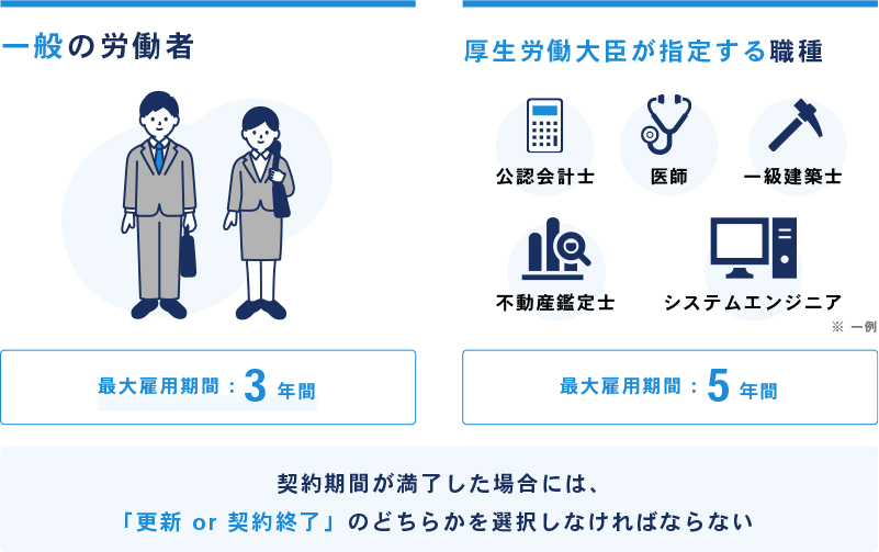 ただし、厚生労働大臣が指定する以下のような職種であれば、契約によって最大『5年』雇用期間を設けることが可能です。