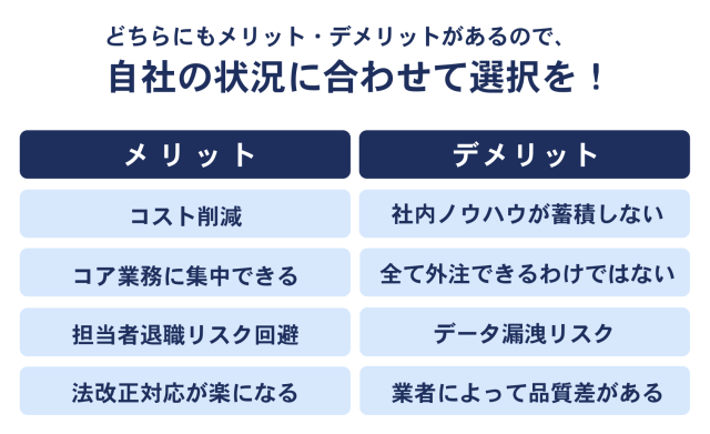 また、アウトソーサーとの連携やデータ提供のために、社内での業務負担が増えることも検討する必要があります。