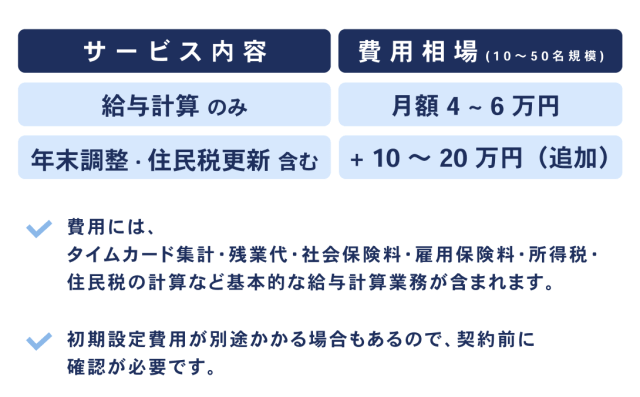 この費用には、基本的な給与計算業務(タイムカードの集計、残業代、社会保険料・雇用保険料・所得税・住民税の計算)が含まれます。なお、初期設定費用が別途必要な場合もあるため、契約前には確認が必要です。