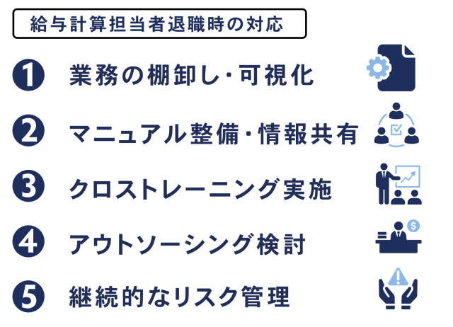 - クロストレーニング: 複数の従業員に給与計算スキルを習得させ、お互いにバックアップできる体制を作ります。