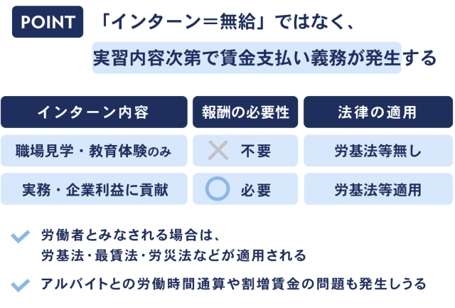実習内容によって「労働者」とみなされる。その場合は賃金を支払わなければ違法