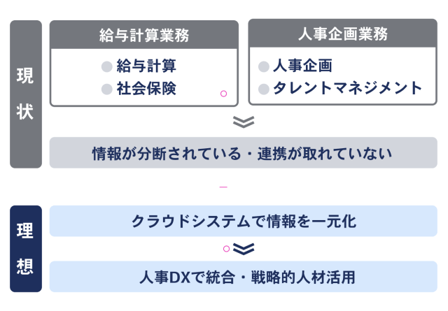 その一方で、制度構築等の人事企画業務のセクションは、給与計算はできて当たり前、人事における必要な情報がなぜ共有できないのかという認識のギャップを起こしてしまう場合が多々あります。