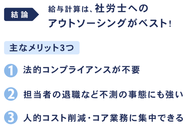 給与計算は社内で行うことも可能ですが、結論から言うと、外部の専門家(特に社労士)にアウトソーシングするのがベストです。