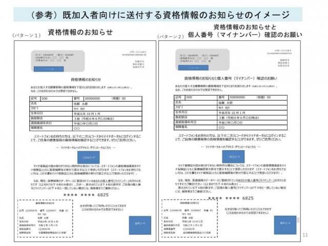 ・「資格情報のお知らせ」は現在各社に届いているものになります。左下の資格情報のお知らせ部分を切り取って、マイナンバーカードと共にお持ちいただけると幸いです。