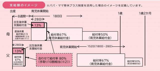 ※出生時育児休業給付金や育児休業給付金と合わせると、休業開始時賃金日額の80%となる