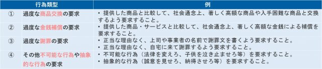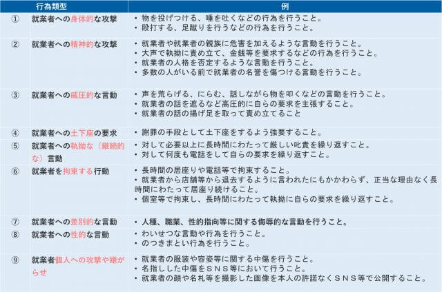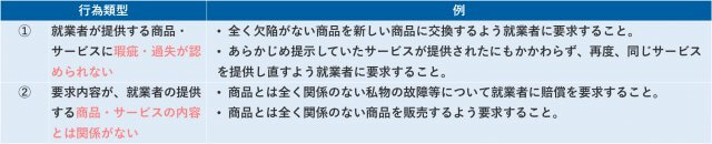 東京都が令和6年12月に公表した「カスタマー・ハラスメントの防止に関する指針(ガイドライン)」では、カスハラを次ように分類しています。