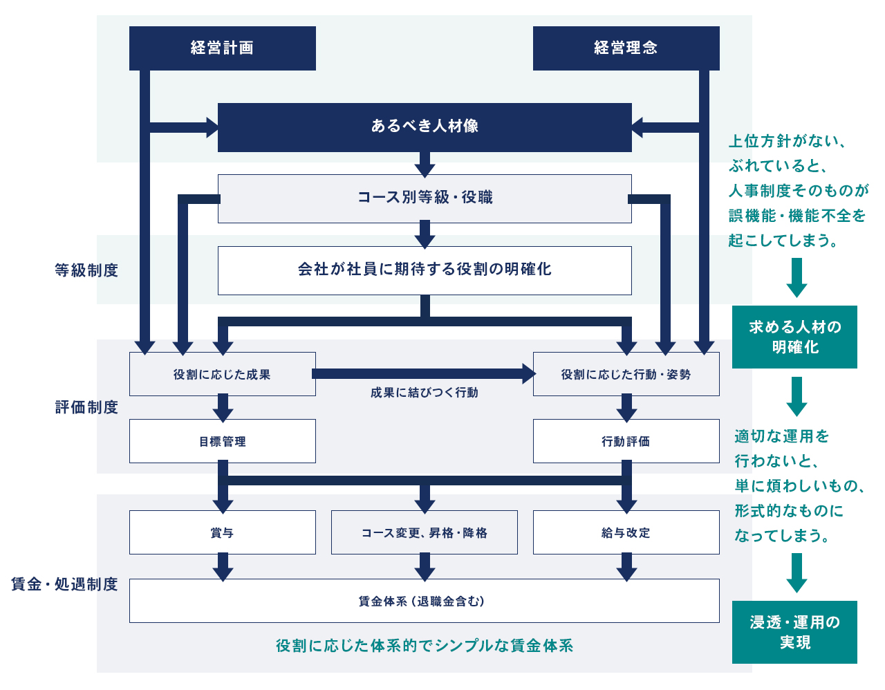 貴社にとって、「何か一番大切か」ということを把握し、さらに一般的な「労働市場の考え方」等を考慮した上で構築する必要があります。